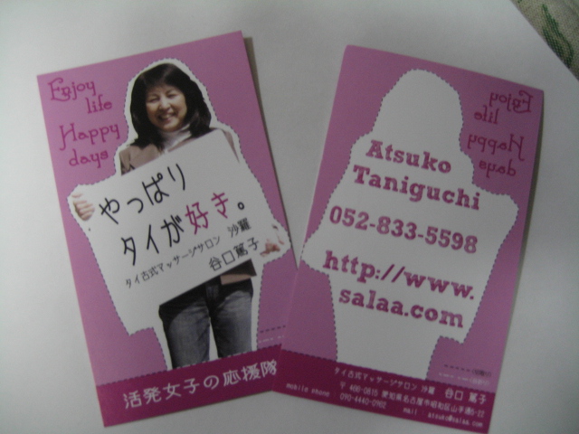 そう言いながら、今日まで、沢山の方と出会いこの名刺をお渡しする機会に恵まれました。皆様に、タイ古式マッサージ沙羅を記憶に留めて頂ければ、作った甲斐があったと言う物です。
