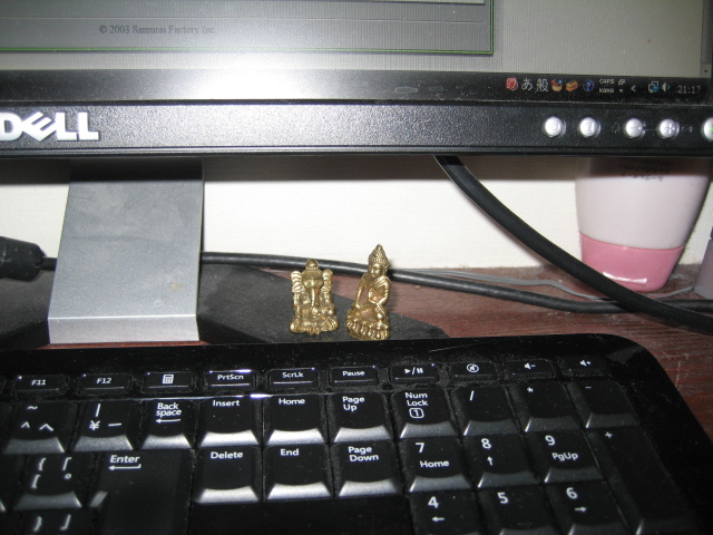 タイ式マッサージ沙羅/名古屋 2012/03/10 他愛もないね こんばんは、名古屋のタイ式・タイ古式マッサージ沙羅です。 今日は、早く家に帰りたい気分! きっと、今夜は、コンビニに寄り道する気がする。 いや、通りがかりに駐車場さえ空いていれば絶対寄る! 無性に何か買いたい!のだ。 え?浪費の病ですか?? いえいえ・・。 l多分、昨日からの続きで身体弱ってるんだ! だからあ~、 ケーキにヨーグルトに焼き鳥と、ビールとするめとピーナッツとお菓子いい~~。 ガネーシャとブッタ。 チェンマイの何時も行くアクセサリー屋さんで買ってきました。 可愛い~。なでなでしても、手に乗せても、見ても可愛い!! マイデスクのこんなところにいます。 大きさチェック! 小さくてかわいらしいでしょ。 Yahooロコプレイス