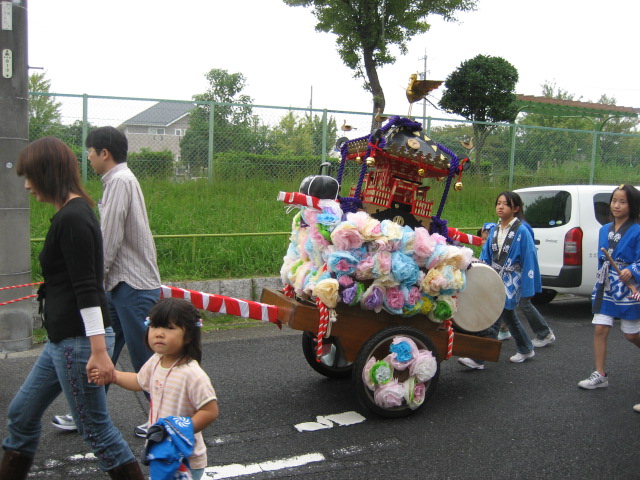 今朝の事です。ピッ、ピッ、ピッ、ピッ と笛の音が、段々と大きくなり祭り行列が、家の前に近づいて来るのを見て、車に乗り込もうとしていた私は、思わず足を止めてその流れをみていた。その時、「あっ!」私の神輿が、、、私が苦労して作った神輿が・・・。(昨日のブログより)花に飾られた荷車の上にのっかって私の前を通り過ぎようとしていました。神輿、健在! あわててカメラを出し撮影しました。(以下3枚)
