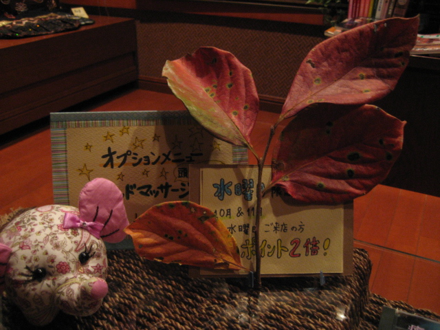 タイ式マッサージ沙羅/名古屋 2011/10/22 秋色の風情 こんばんは、名古屋のタイ・タイ古式マッサージ沙羅です。 今日も一日が、終わりました。 お客様、ありがとうございました。 私のデスク横壁に、ユチョン君のカレンダーかけました。 これで、写真が3枚、目の入る位置に・・・。 う~~ん、可愛い!! いい年して、すみません。 昨日、我が家のテーブルの上に秋色に染まった一本の小枝が・・。 う~ん、いいんじゃない! あきだ! ちょっと、もの寂しい秋が、ここにいた! 沙羅で季節を感じて貰おうと、気にせず黙って持ちこみました。 沙羅のウエーティングルームへ置きました。 こんな風に (上写真) 風情ですね・・・・。 秋 ・ 秋 ・ 秋 ・ 秋 ・ 秋、 そんな、秋の日を送りながら、街路樹が赤く染まり、落ち葉となる日もあっという間なんでしょう。 季節は、巡る巡る・・・・。 またもや、今日の私は、感傷的になっております。 Yahooロコプレイス