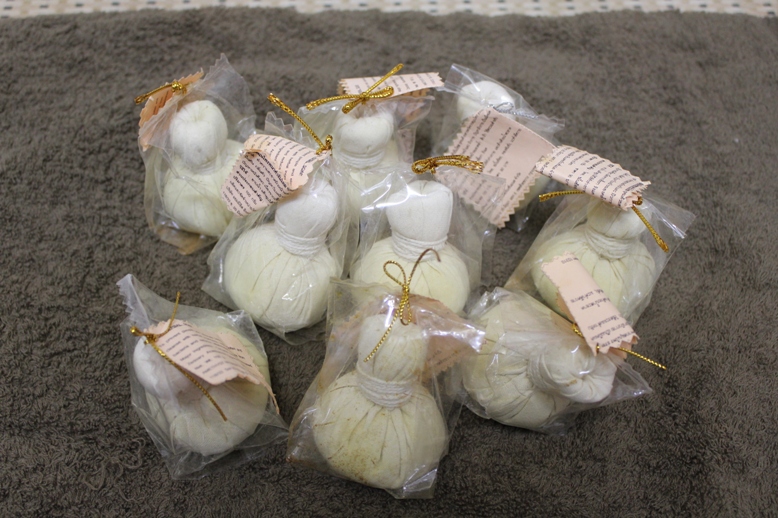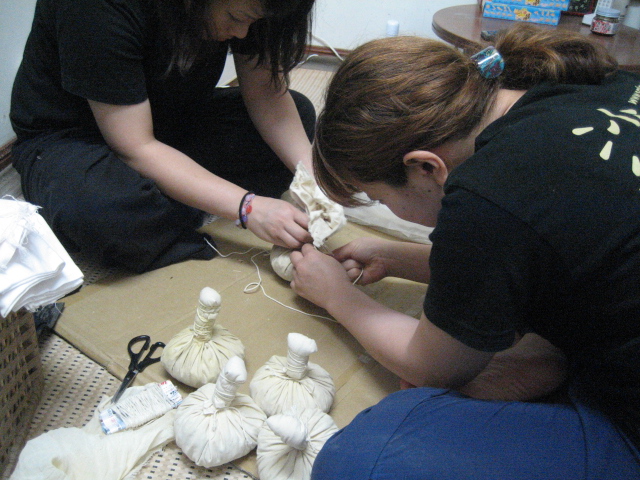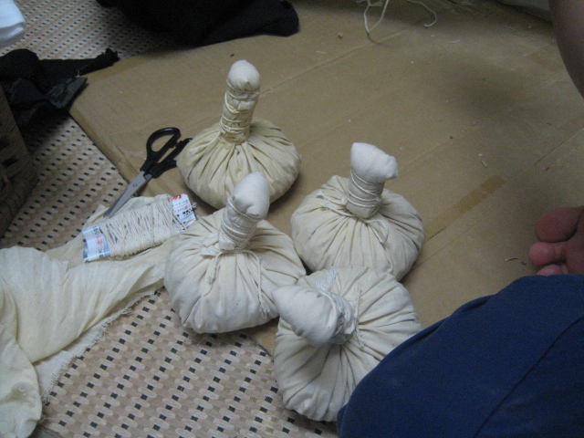 タイ式マッサージ沙羅/名古屋 2011/07/10 ハーブボール作ります こんにちは、名古屋のタイ古式マッサージ沙羅です。 ハーブボールって皆様、ご存知ですか? 布に包んだハーブボールを蒸し、センにそってあてたり押したりたたいたりしながらマッサージすることをいいます。また、特に緩和したい患部にあてたり、押したりもします。ハーブの成分を皮膚から体内に浸透させ、筋膜を広げ、靭帯・筋肉・関節を柔軟にし、血液の循環を高めたりします。香りのもつ有効成分が精神面、肉体面に働きかけます。 <注意> *使用後すぐに洗い流さないようにします。 <効果> * 腫れがひく、手足の関節の痛みをとる、筋肉痛やこりをとる。 * 血液循環を促進する。 産後の肥立ちをよくする。 * リラックス作用 ハーブボールの中には ぽんつく生姜・ウコン・こぶみかんの皮・レモングラス・タマリンドの葉・・、などなど入っています。 沙羅では、120分以上のタイ古式マッサージコースに、このハーブボールの施術が入っており(選択 )受けられた皆様、皆様に、満足して頂いています。 ホント、気持ちいいです。 この、ハーブボール作っちゃおう!! タイ・チエンマイで某スクールのハーブボールを開き、中に入っている、ハーブの名前を書き出してもらい(タイ語で)ムアンマイ市場へ買いに行った事があります。 市場の路地をぐるぐる回り、見つけたのは、漢方薬のお店でした。 早速、書いて貰った紙を出し、これが欲しいと言ったら、ない物が数種類ありましたが、あとは、そのとおりに出してくれました。 昨日、スタッフに手伝って貰い、そのハーブを小さく切り全部を混ぜ合わせました。 もちろん、ハーブボ~ル作ります。 実は、お顔用のハーブボ~ルも購入したことあります。←左写真2枚 通常のハーブと違い、刺激の少ないお肌に良い(マンゴスチンなど)ハーブが、使用されていす。 従って1個単価高いです。 もちろん、使おうと思ったんですが、中々、導入できずに使用してません。 こちら、幾つも無いので、ご来店のお客様に差し上げようかと思っています。 話戻って、下記写真が、ウコン・レモングラス・こぶみかんの皮・ジンジャー などなど混ぜ合わせたものです。これに写真右の塩・竜脳・樟脳を混ぜ合わせます。 これを、布にくるんでボール上にします。 床にどかって座って、あーでもない、こーでもないとお喋りしながら、ハーブを切ってる様は、さながら、タイの雰囲気でした。 沙羅タイ古式マッサージスクール授業の中でも、ハーブについて勉強してもらっています。 体験をもちろん、してもらうのですが、ここでも受講の方々の気持ち良いですよねという言葉を頂きます。 施術済のまだ、熱が取れ切っていないハーブを自分の腰に当てて、「う~~」 「気持ち良いわあ~っ」て、こそっと呟いている、私です。
